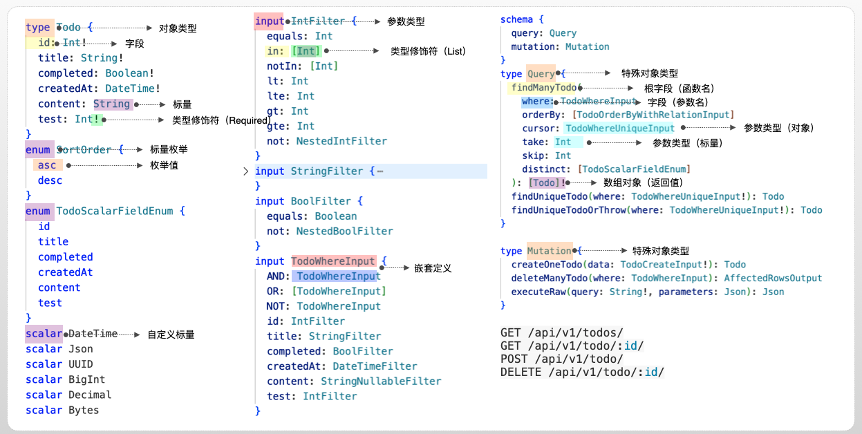 在这里，我们要注意下，type和input定义的对象，都支持嵌套定义，即todowhereinput类型的字段也可以是todowhereinput，可以是别的对象类型，如Intfilter。