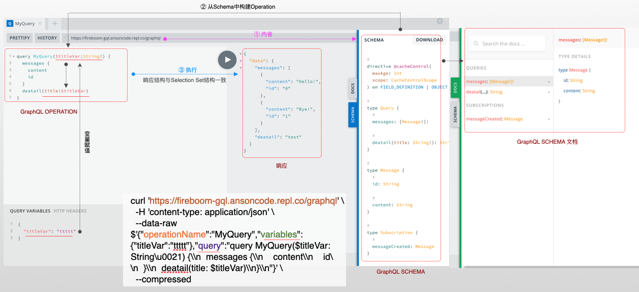我们以该opration为例，它有2个根字段：message和detail，其中messsage字段的类型为对象，且无入参；detail的类型为标量，有一个入参title，并通过Operation的变量$titlevar为其赋值。