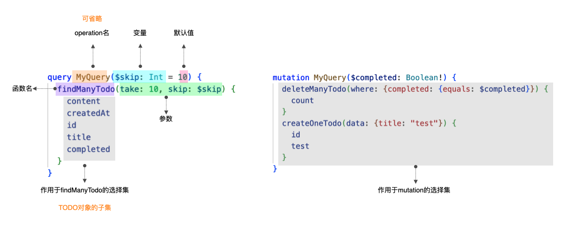 如该operation 调用了 findmanytodo函数，字段入参分别是take和skip。其中take为固定值10，skip为变量值，由变量$skip传入。