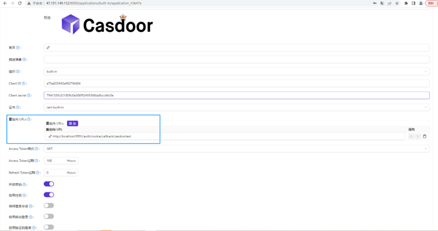 在Casdoor中配置登录回调 URL:http://localhost:9991/auth/cookie/callback/casdoortest(其中casdoortest对应飞布中的供应商ID)