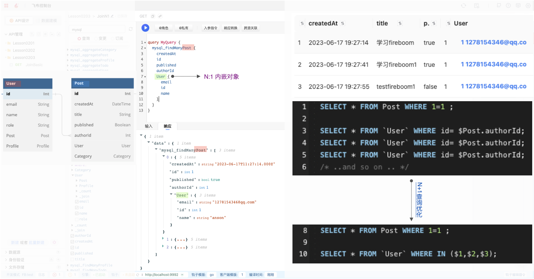 我们构建了如图所示多级嵌套查询 OPERATION,以 User 表为主体,查询到的 Profile 是对象,查询到的 Post 是数组,Post 中的 Category 也是数组。