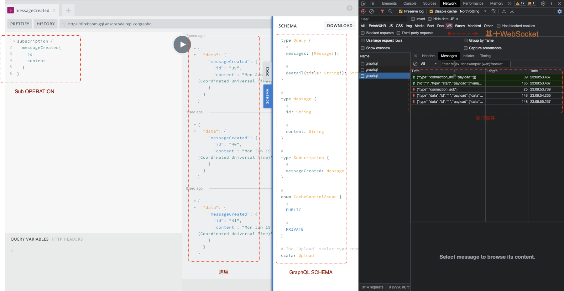 例如，下面是一个基于[NodeJs构建的GraphQL 服务](https://docs.fireboom.io/he-xin-gai-nian/graphql#graphql-server)，正在执行订阅请求，数据通过WebSocket不断推送到客户端。