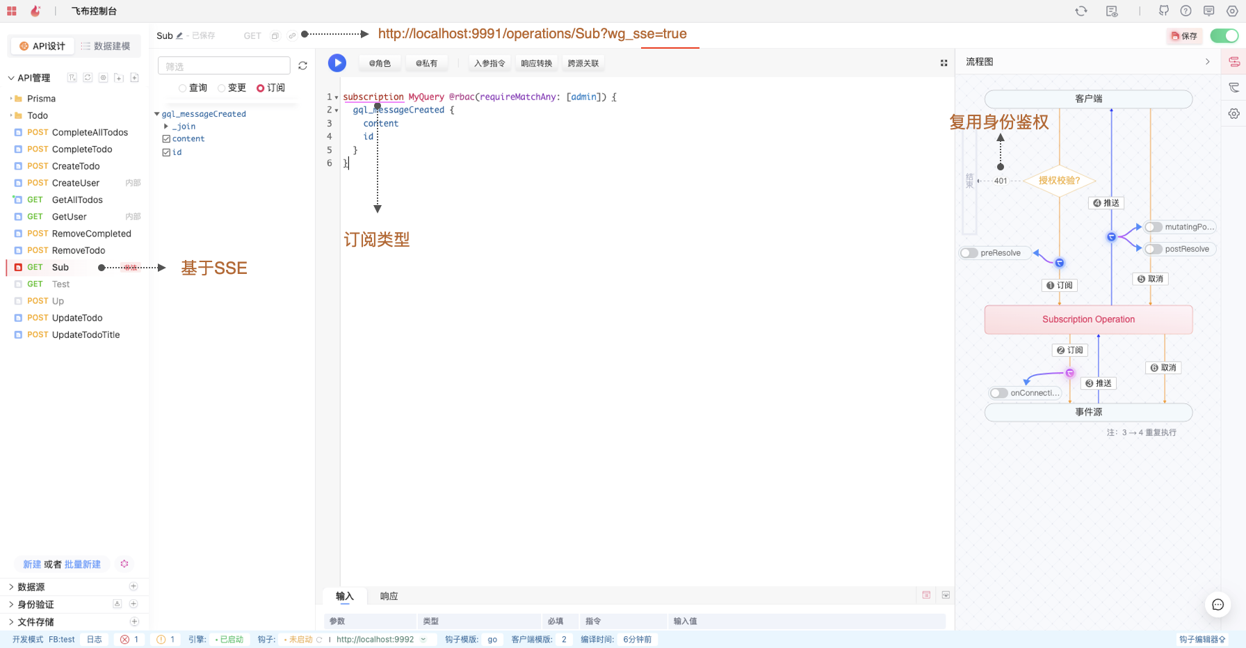 同理，订阅OPERATION编译的REST API也可复用HTTP的身份鉴权。在该OPERTION中设置的登录校验或者权限控制，无需任何额外操作，都可以应用到实时推送接口中。