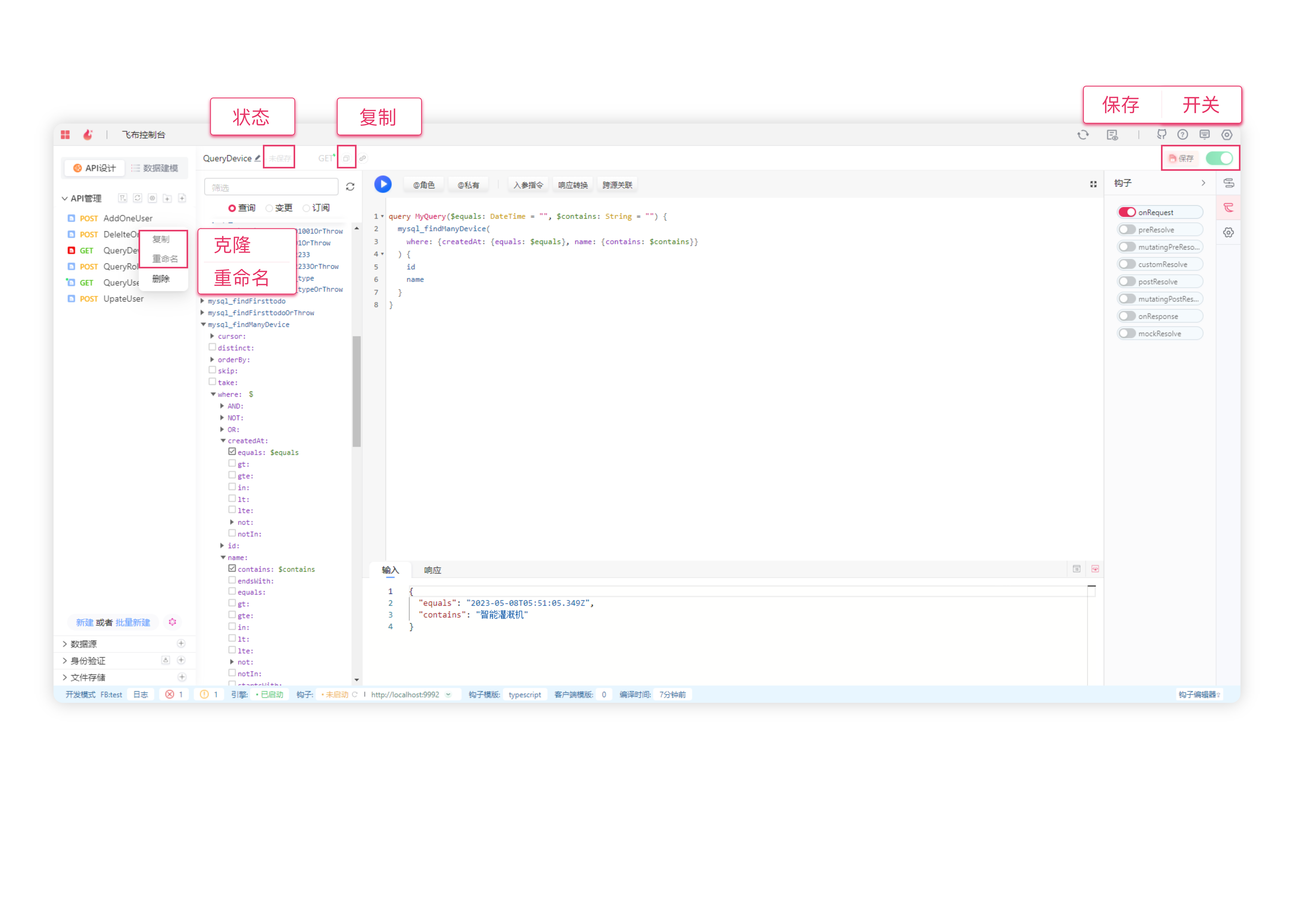 工具栏主要为GraphQL指令的可视化封装。用于帮助开发者快速掌握飞布指令的使用方法。