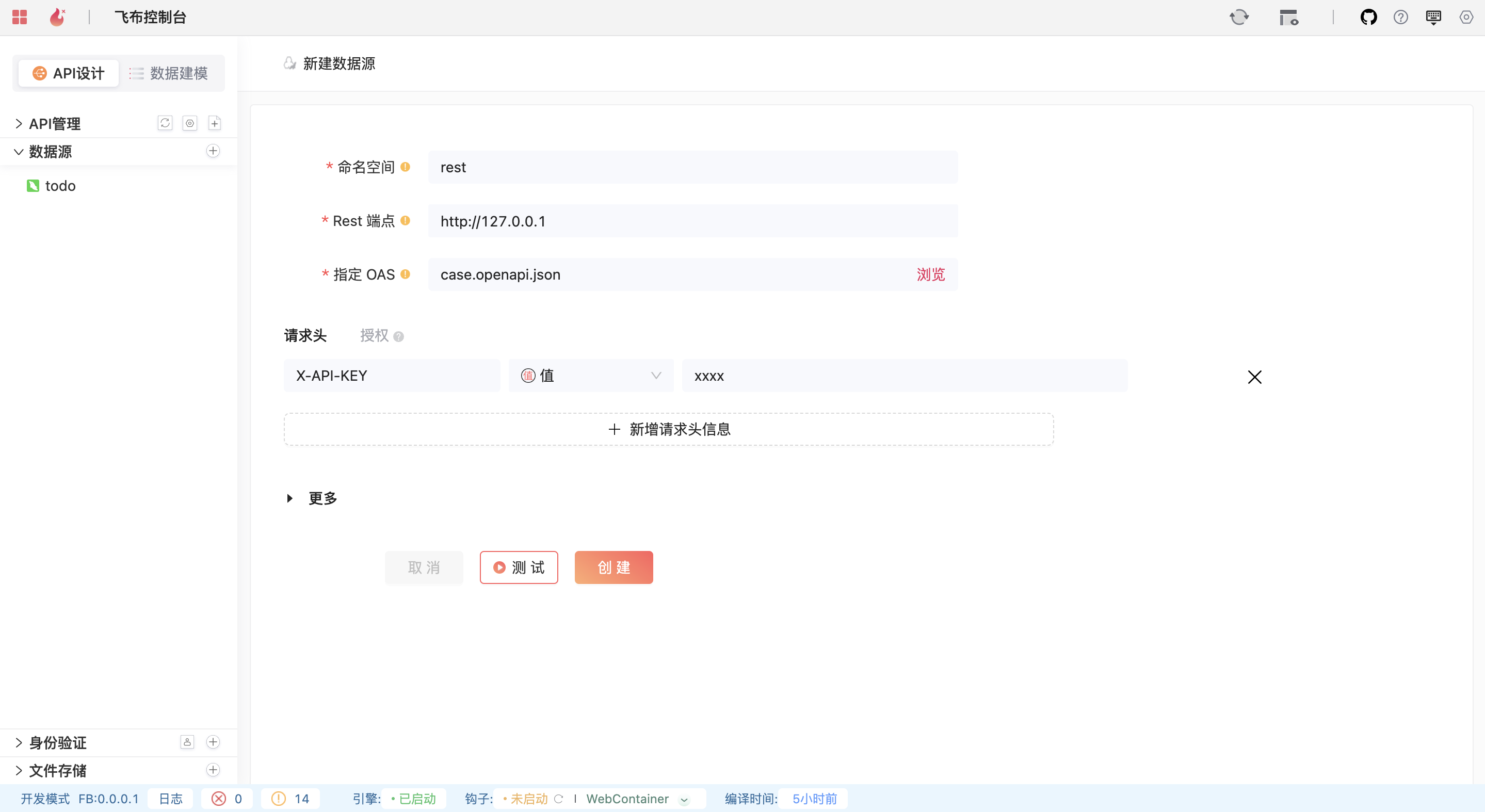 针对该REST数据源，飞布将始终发送`X-API-KEY:xxxx`请求头。由于该信息存储在服务器上，因此是一种与受保护数据源进行通讯的安全方式。