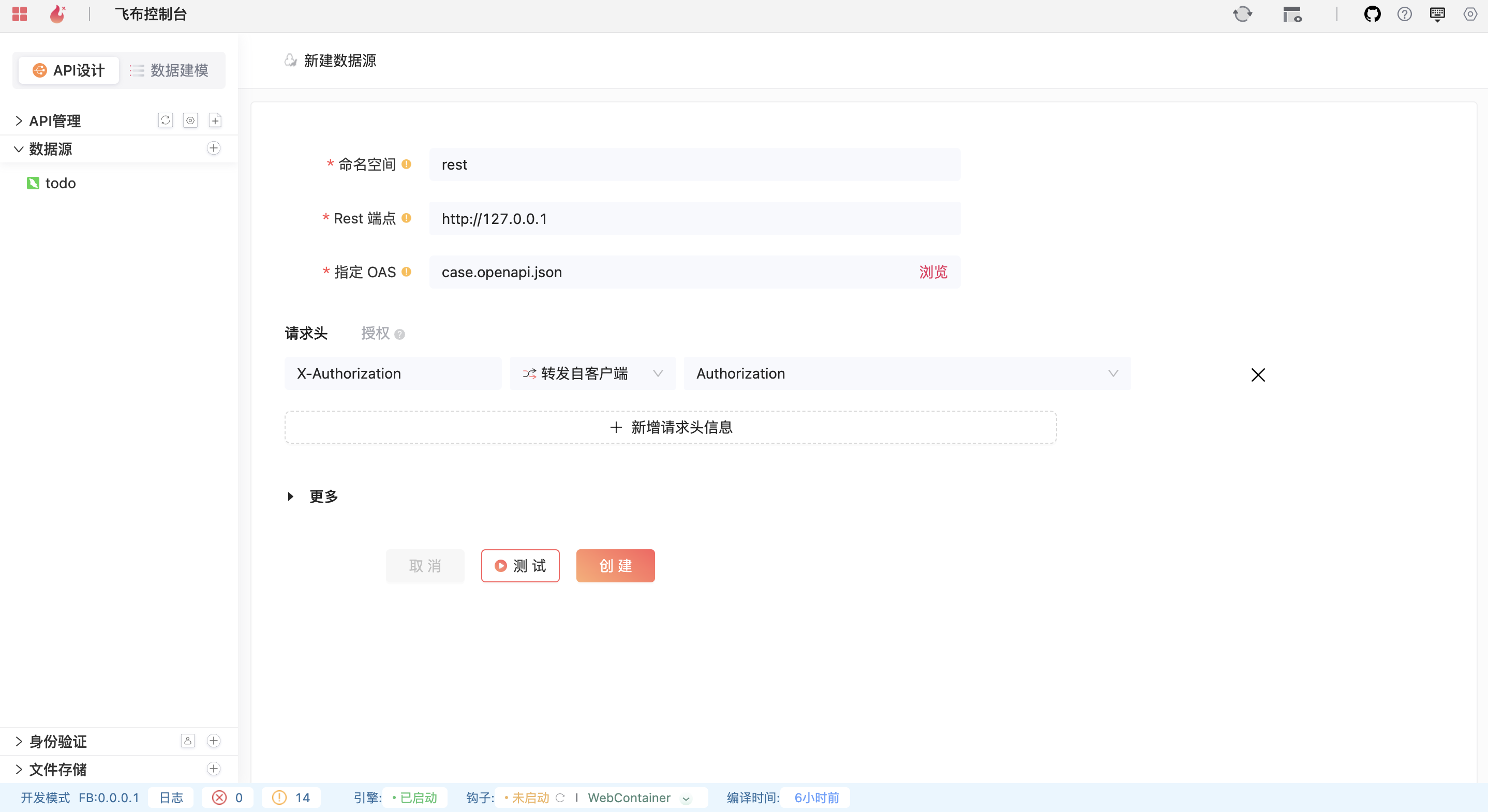 **新建数据源** -> **REST API**，设置参数，如名称、OAS文件和rest端点。一般OAS文件中共包含rest端点信息，系统自动解析OAS并填写rest端点默认值。