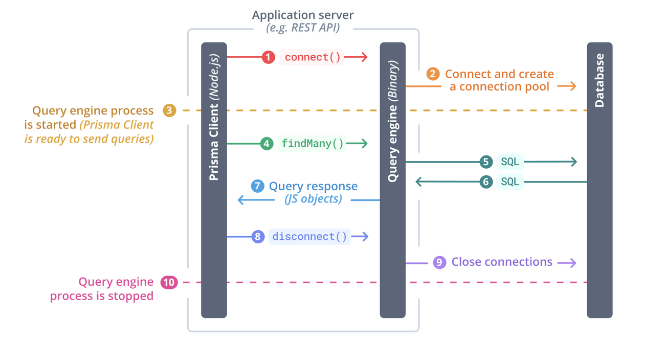 Prisma查询引擎是一个常驻WEB SERVER，用于执行GraphQL Operation（通过HTTP协议或NODE API）。本质上是将GraphQL Operation转换成SQL语句，发送至数据库执行，并将查询结果拼装成JSON响应返回。下图是Prisma Client调用查询引擎的原理图。