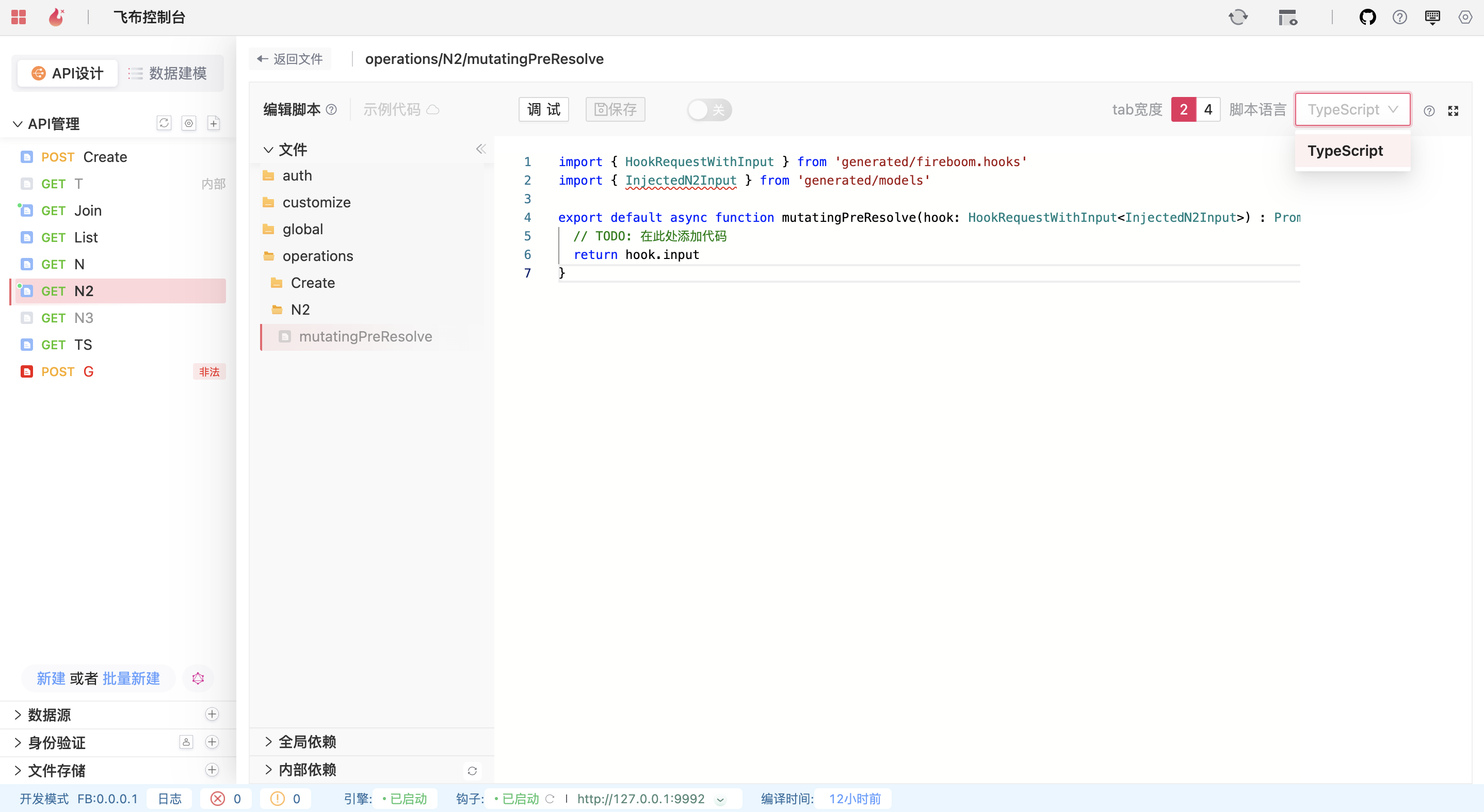 为了实现和传统开发一样的“PRO CODE”能力，飞布实现了基于HTTP协议的钩子机制，开发者可以用任意喜欢的后端编程语言，如Java、Golang、PHP、Node.js等，扩展API，实现自定义业务逻辑。目前飞布已经官方支持了Node.js SDK，Golang SDK正在开发中。