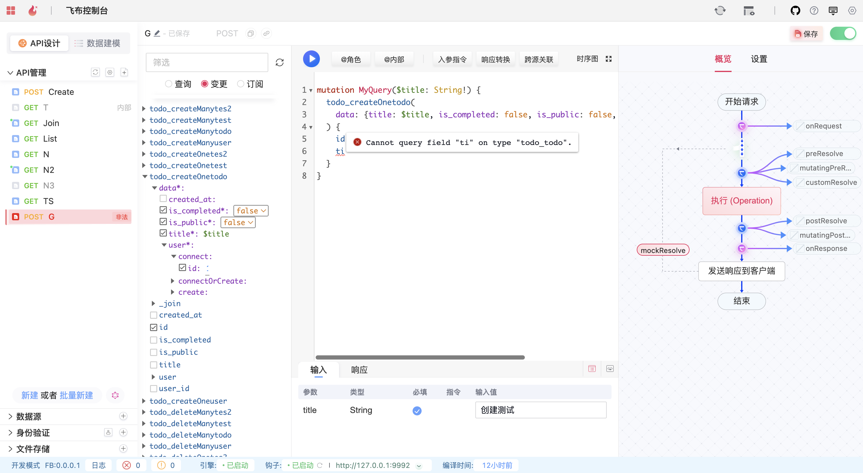 依赖于graphql的内省特性，飞布可自动内省数据库表结构，检测并提醒哪些API非法。开发者根据界面提醒，稍微删减字段，就可实现功能变更。