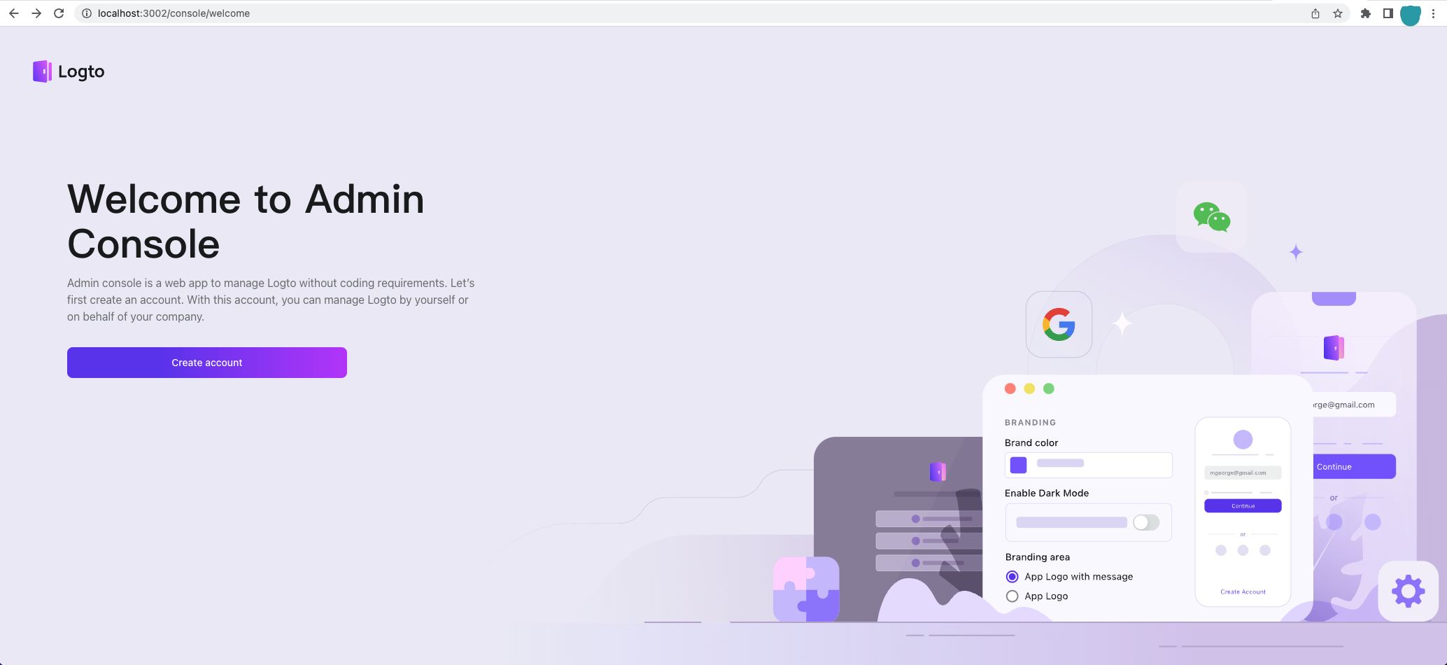 1. 按照 [Github 中的说明](https://github.com/logto-io/logto#launch-logto)安装好 Logto，打开 <http://localhost:3002> 访问 Logto 后台并初始化一个管理员账号\\