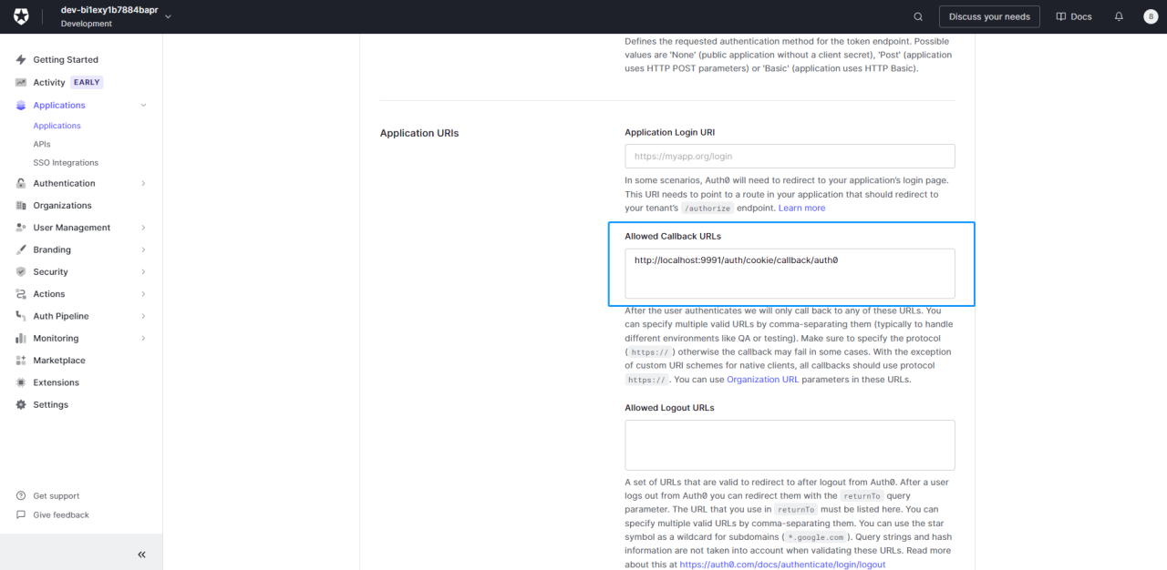 配置Allowed Callback URLs：<http://localhost:9991/auth/cookie/callback/auth0（其中auth0可修改为其他）>
