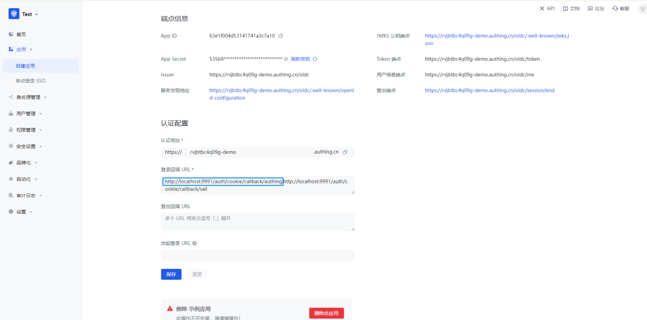 配置登录回调 URL：<http://localhost:9991/auth/cookie/callback/authing（其中auth0可修改为其他）>