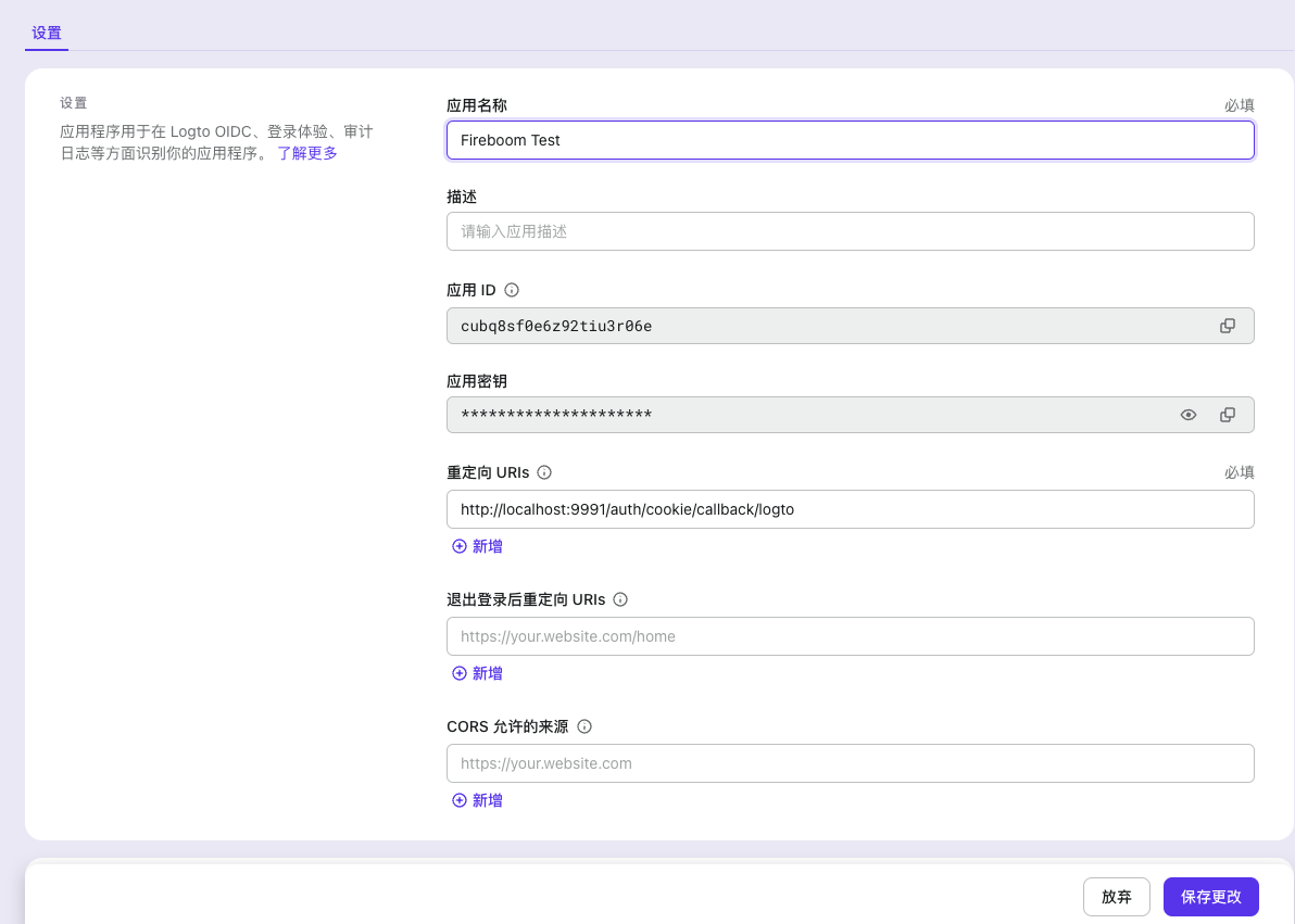 4. 跳过示例，在应用信息页修改应用名称，并添加“重定向 URIs”，该值可以从 Fireboom 认证源页面获取到（在第5步图中可以看到登录回调地址为 <http://localhost:9991/auth/cookie/callback/logto> ）\\