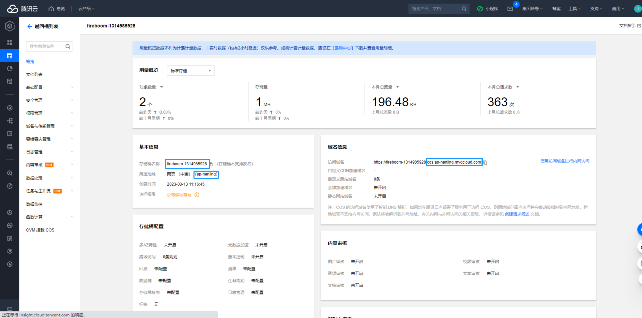 存储桶创建完成后，可在存储桶列表中点击对应的配置管理按钮，即可获取存储桶名称、所属地域、访问域名信息