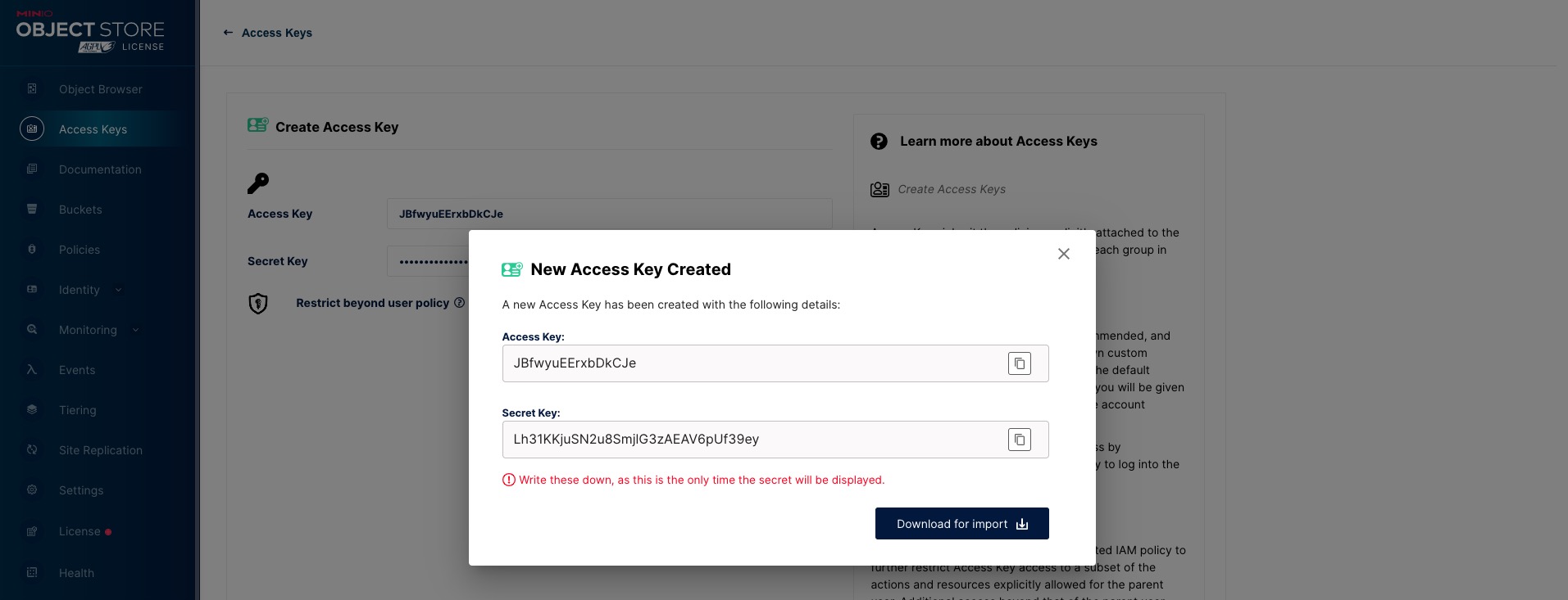 <figure><img src="https://2514536170-files.gitbook.io/~/files/v0/b/gitbook-x-prod.appspot.com/o/spaces%2FhvHBEKUXoqt1bL00q2Ra%2Fuploads%2Fgit-blob-2f51f3fec94e4e38e6aa7c7c6a82762e299f6968%2Fminio-key.jpg?alt=media" alt=""><figcaption></figcaption></figure>