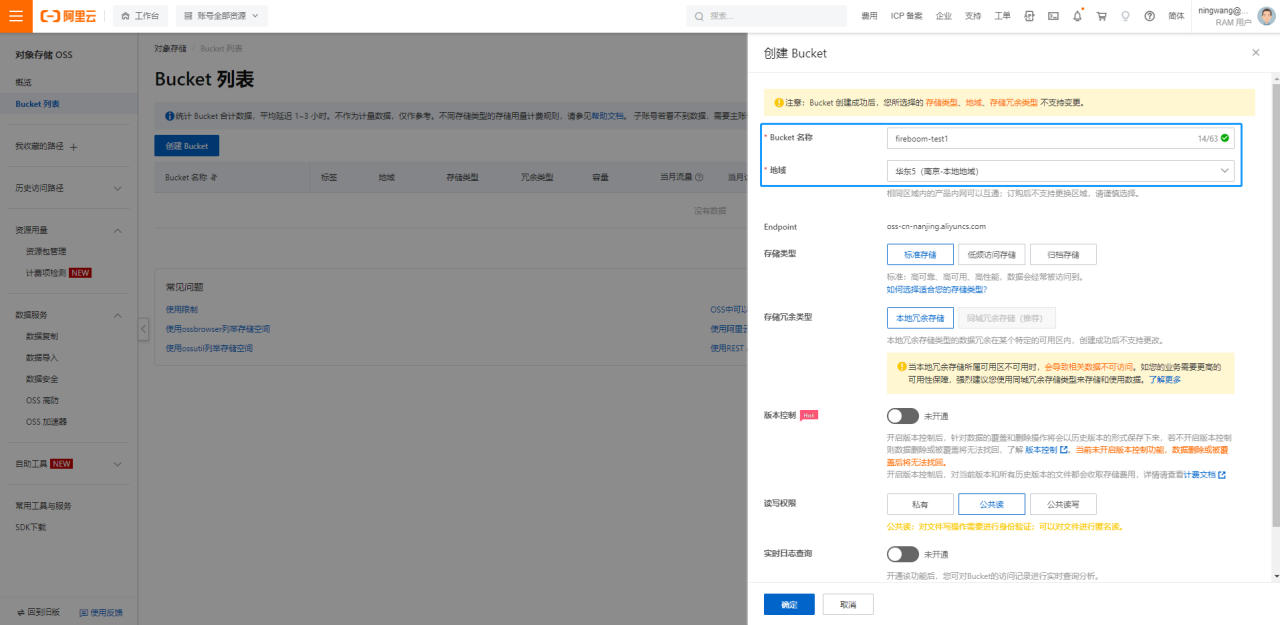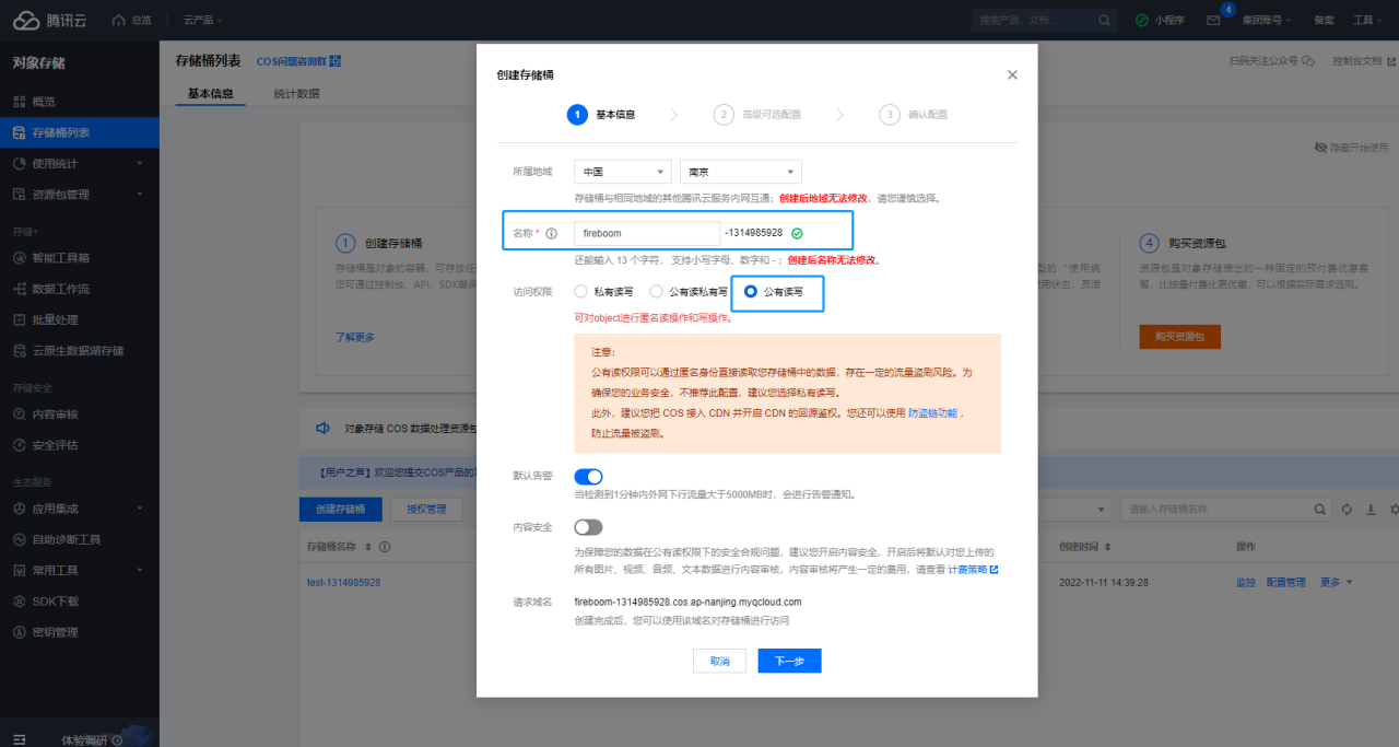 在存储桶列表页，进行创建存储桶操作