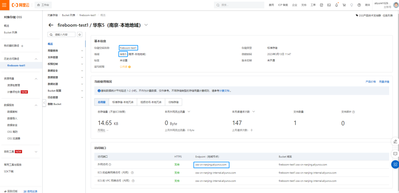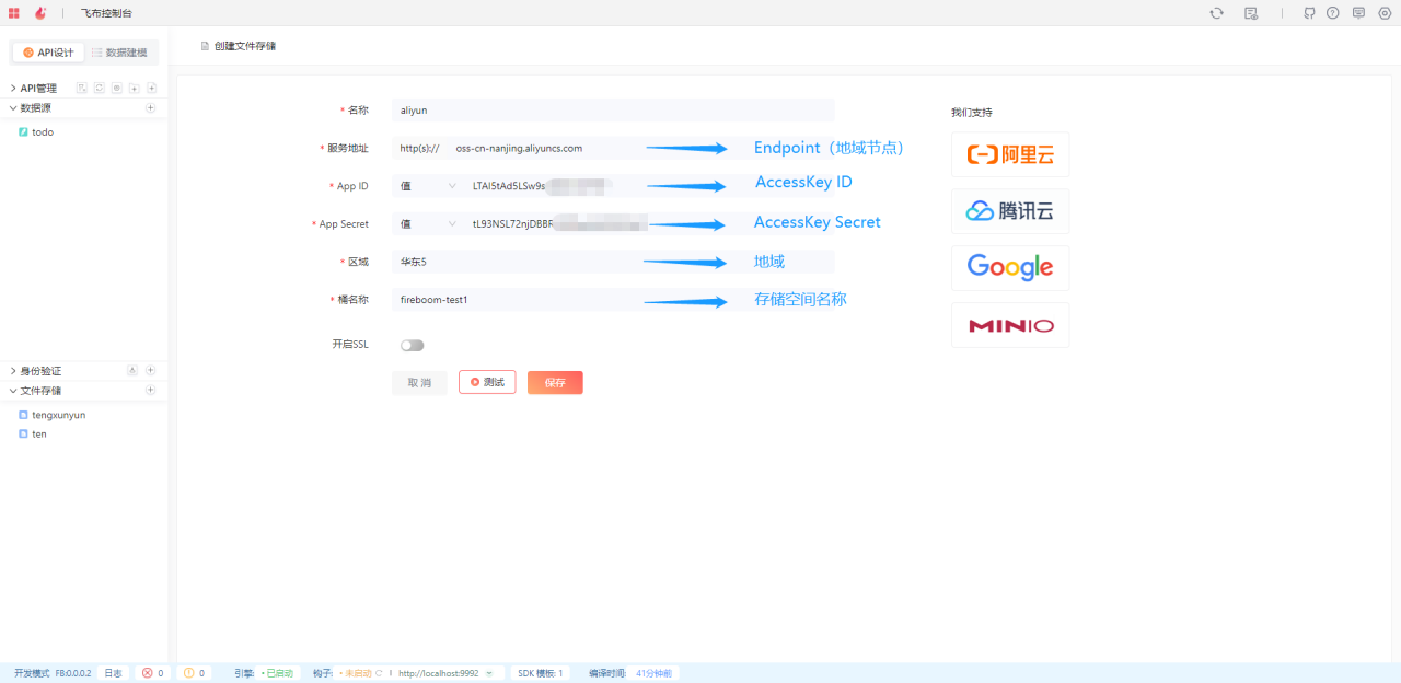 在飞布文件存储模块，进行新增文件存储操作，将阿里云中获取的信息填写至对应的输入框中，保存完成即可