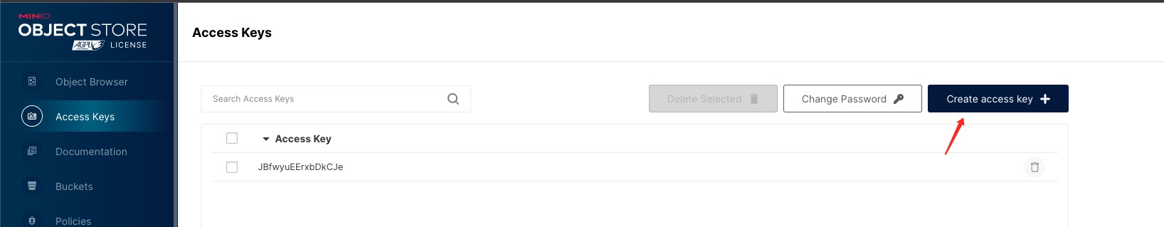 参考官方文档<https://min.io/download>完成安装，打开控制台页面，点击`Access Keys`，点击`Create access key`，创建一条新的认证配置信息，复制并粘贴到 Fireboom 中。