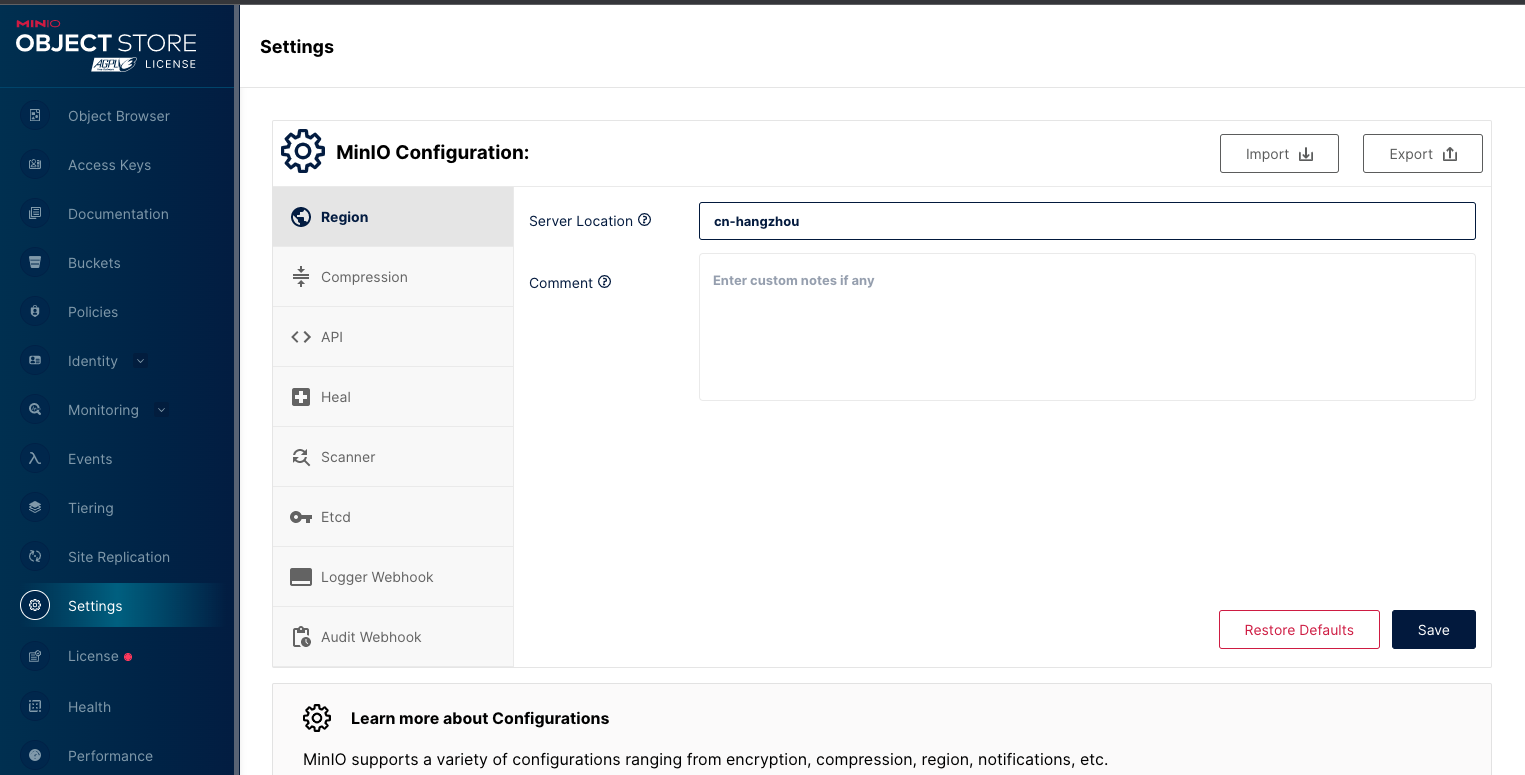 <figure><img src="https://2514536170-files.gitbook.io/~/files/v0/b/gitbook-x-prod.appspot.com/o/spaces%2FhvHBEKUXoqt1bL00q2Ra%2Fuploads%2Fgit-blob-55ba0cb59cba15d4e948d3ac510b3b1166a8e093%2Fminio-region.png?alt=media" alt=""><figcaption></figcaption></figure>