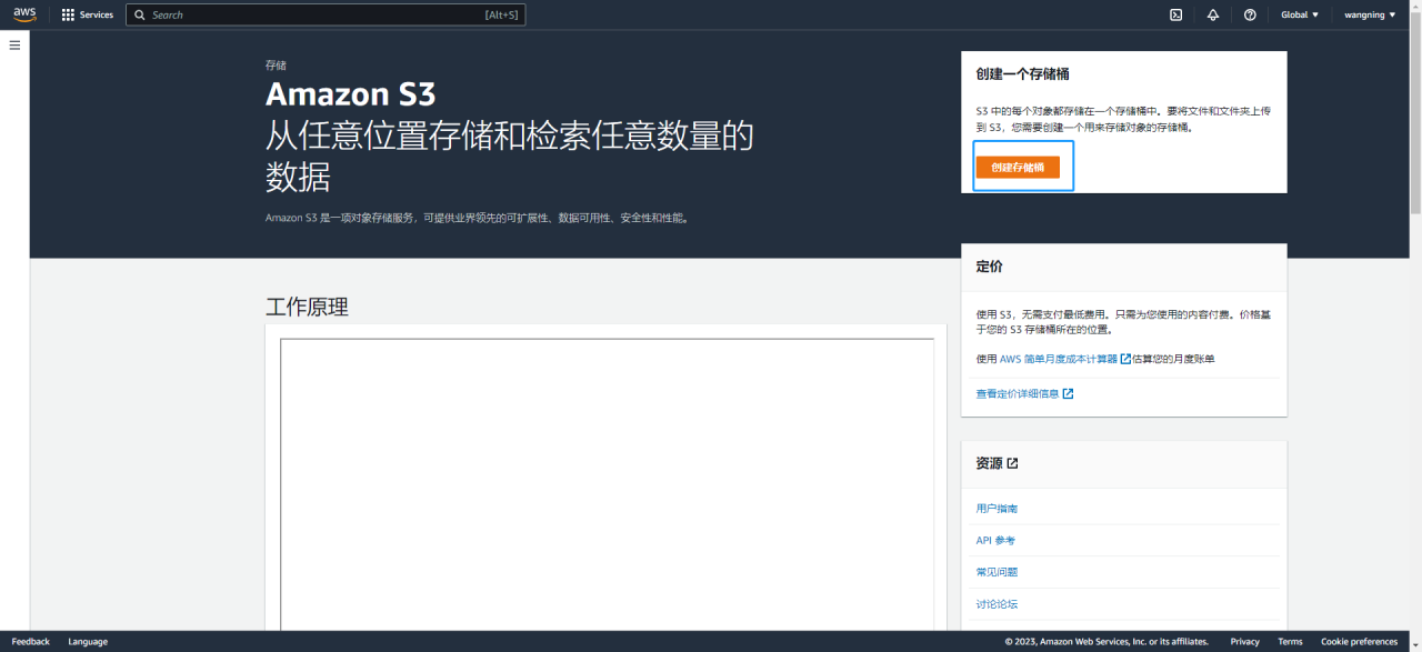 进入亚马逊官网<https://console.aws.amazon.com，登录成功后，打开控制台页面，搜索s3，进入到存储桶页面，进行创建存储桶操作>