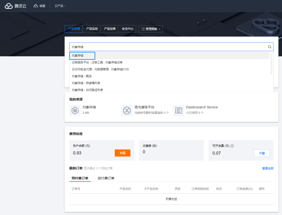 进入腾讯云官网<https://cloud.tencent.com/>，登录成功后，打开控制台页面，在控制台页面-产品管理页，搜索对象存储，进入到对象存储页面