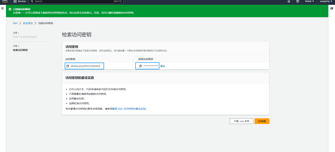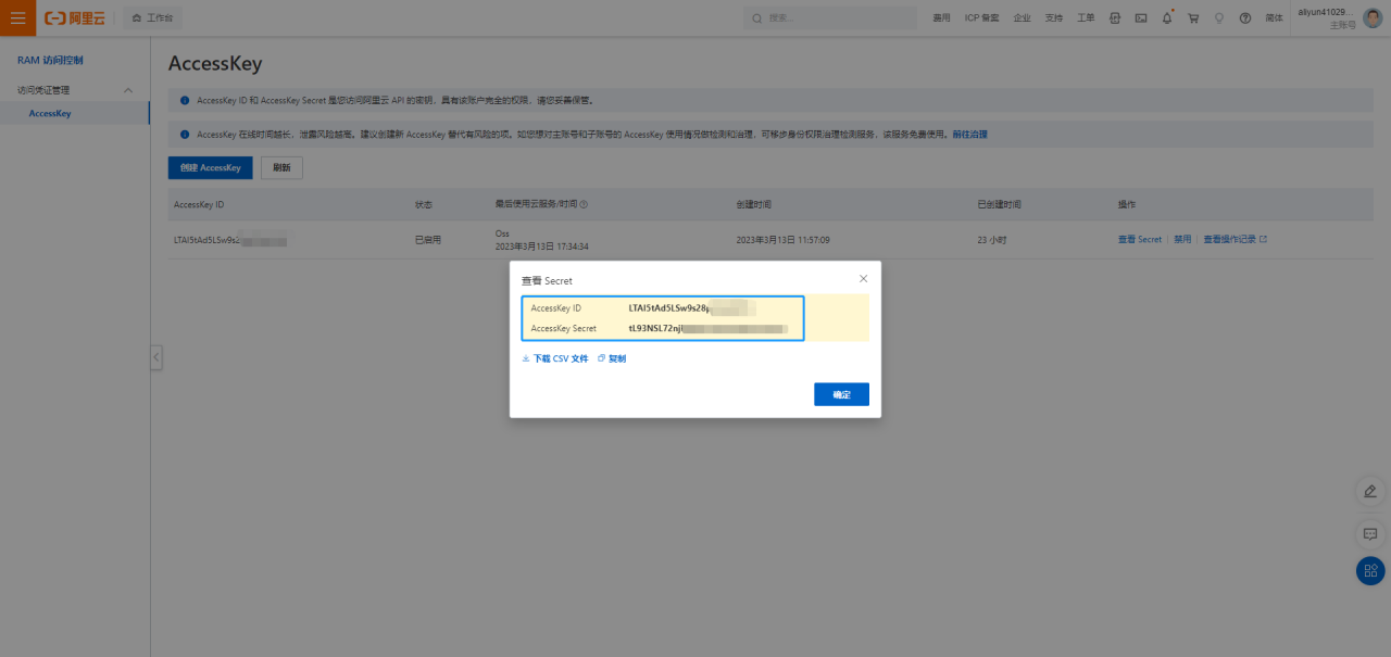 密钥创建成功后，获取访问密钥和秘密访问密钥