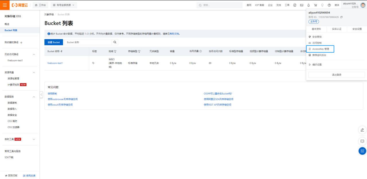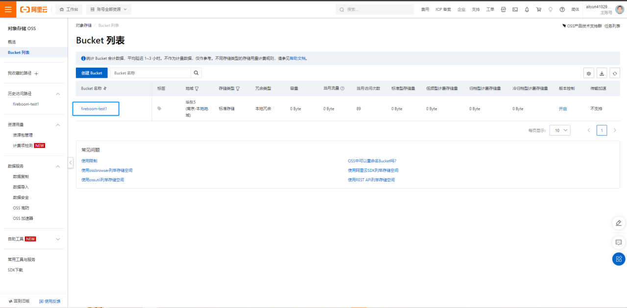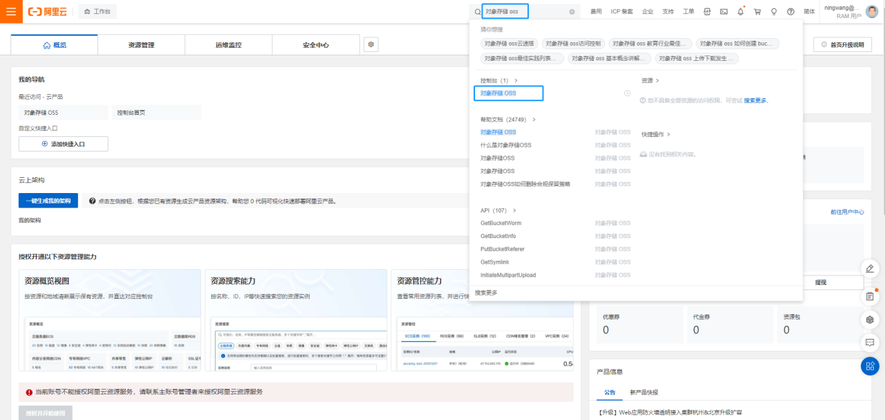 进入阿里云官网<https://www.aliyun.com/>，登录成功后，打开控制台页面，在控制台页面-产品管理页，搜索对象存储，进入到对象存储页面