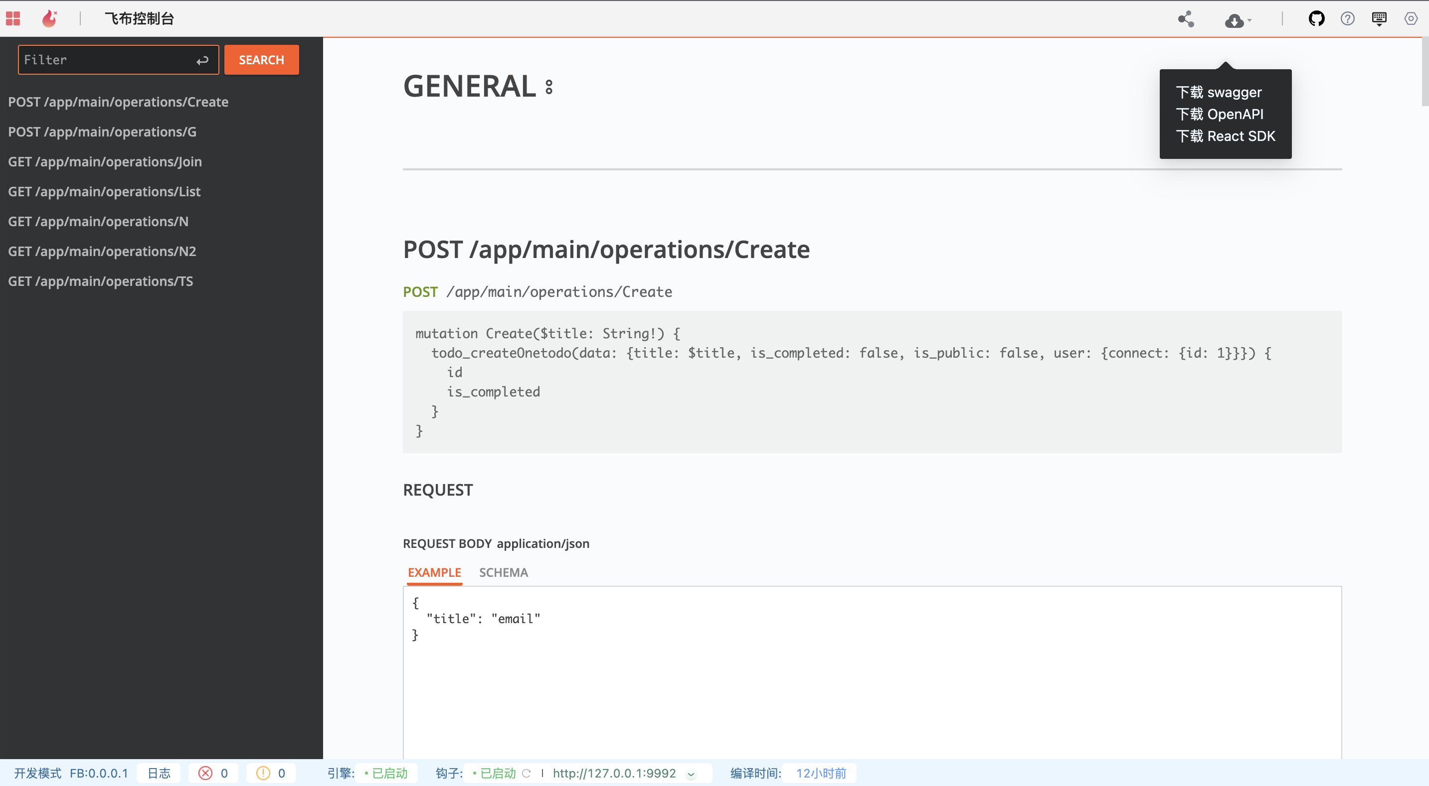 依赖于graphql强大的类型系统，飞布可实时将API生成swagger文档和各客户端语言的SDK，如ts、flutter等。后端无需写文档，更不用手工维持一致性；前端直接调用对应SDK，并根据语法提醒，对接接口。一旦接口变更，SDK也实时更新，对于强类型语言的SDK，语法报错将帮助前端开发者定位到变更处。
